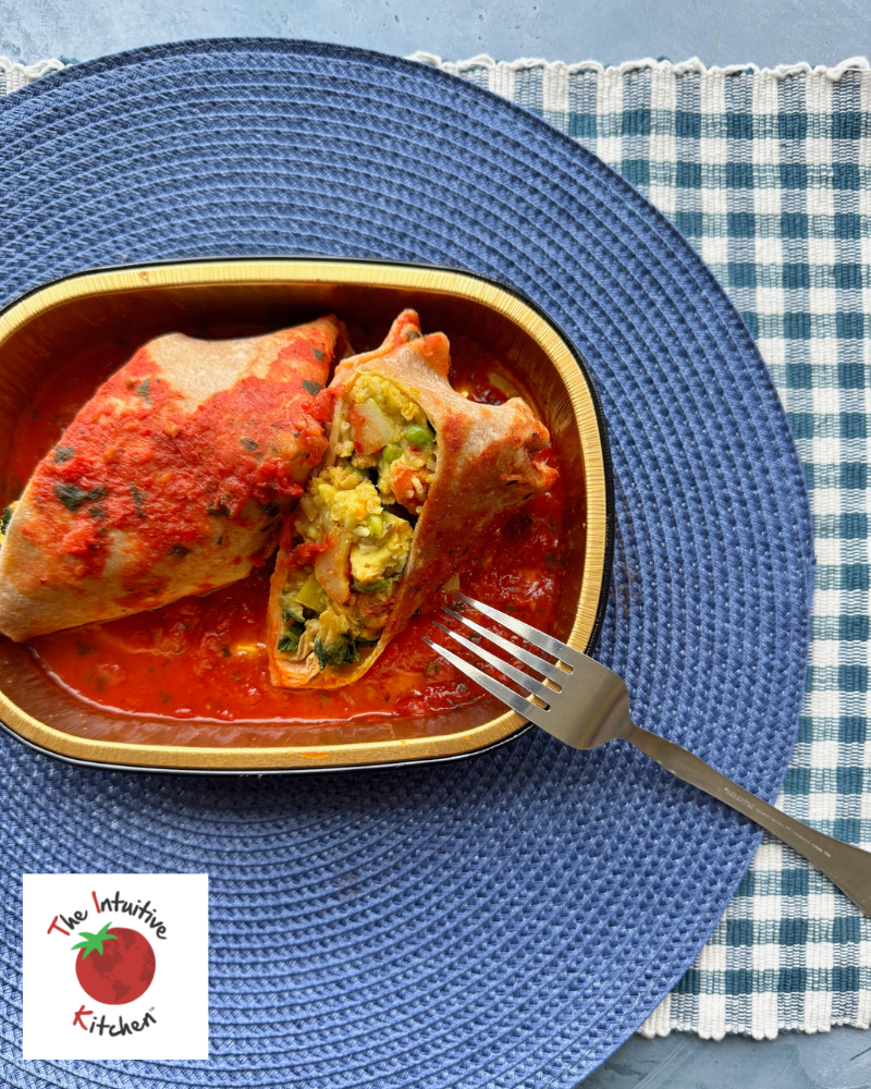 A flavorful fusion of comfort and spice! These plant-based wraps are stuffed with savory faux chicken, chickpeas, cauliflower, potatoes, basmati rice, spinach, and a medley of veggies—all simmered in creamy coconut milk and tucked into a whole wheat tortilla. Served with a sweet, sour, and spicy sauce that ties it all together. Bold, hearty, and 100% vegan—made with love by The Intuitive Kitchen.