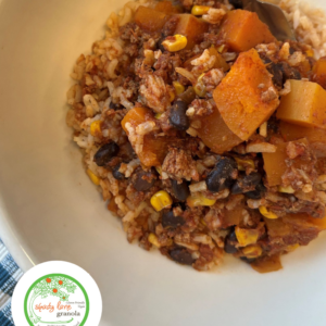 From your favorite plant based shop, Basil and Bunny.  The Harvest Sweet Potato Enchilada Bake is a hearty, plant-powered dish featuring corn tortillas filled with a rich medley of roasted sweet potato, black beans, local kale, and bell peppers. Wrapped in corn tortillas and blanketed with a deeply flavorful, savory red enchilada sauce that brings warmth and a touch of spice. The dish is then topped with a generous sprinkle of fresh green onions for a mild, zesty bite and a layer of melty plant-based cheddar shreds that add a creamy finish. This comforting, colorful bake is the perfect balance of sweet, savory, and satisfying, making it a delicious way to enjoy seasonal, plant-based ingredients.