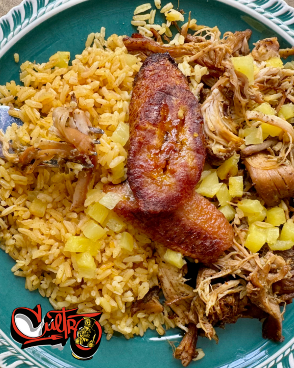 A customer favorite! Tender, slow-cooked chicken thighs infused with rich, smoky flavors, served over fragrant yellow Spanish rice. Sweet plantains and juicy diced pineapple add the perfect touch of sweetness to balance every bite. This comforting dish, made by the ever-popular Cultrō, one of Rhode Island’s busiest food trucks, known for bringing bold Caribbean flavors to breweries, farmers markets, and food truck events across the state.