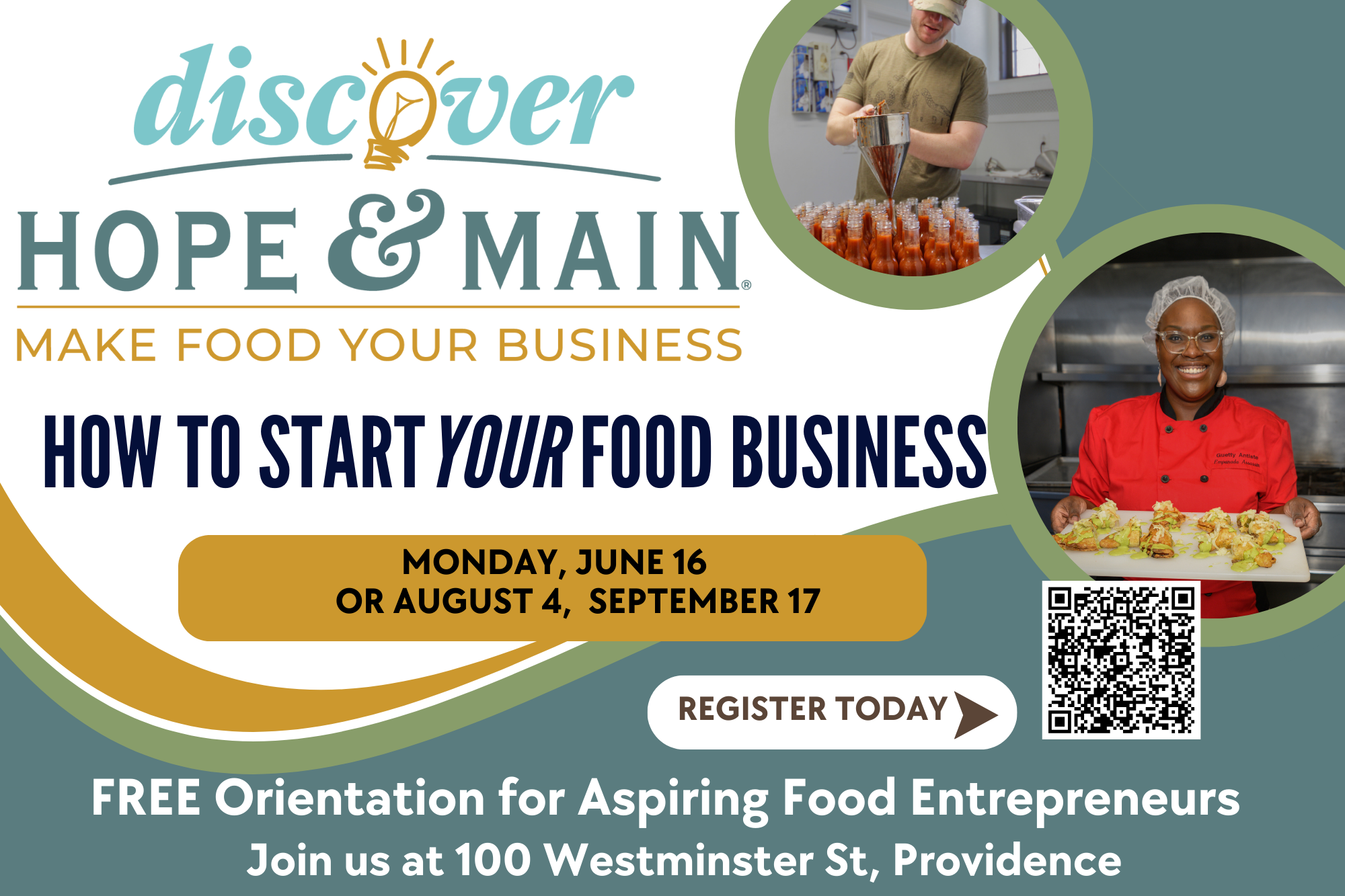 Register Now: Discover Hope & Main FREE Orientation for Aspiring Food Entrepreneurs Curious about starting a food business? Join us for a free session designed to answer your biggest questions and help you take the first step. Hope & Main is Rhode Island’s premier culinary incubator—not just kitchen space, but a community and support system....